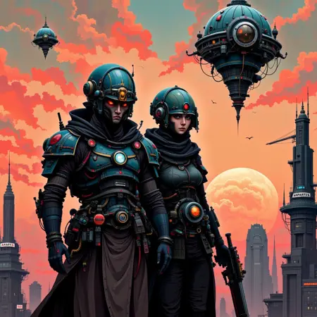 The model demonstrates particular strength in rendering helmeted figures in elaborate technological gear against dramatic skyscapes, with a consistent stylistic approach that blends sci-fi, steampunk, and post-apocalyptic aesthetics into a cohesive visual language.