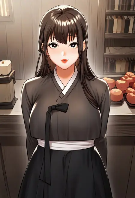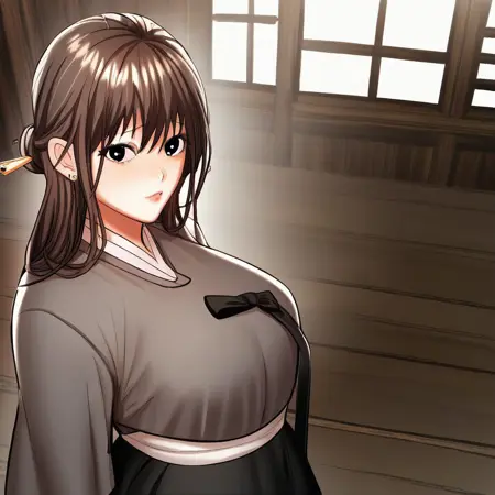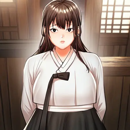 (lora:older_sister_(sponsor_me_please):1,older_sister_(sponsor_me_please),细腰,宽臀,美丽的皮肤,深棕色锐利双眼,清澈眼睛,明亮瞳孔,美丽眼睛,乌黑秀发,长发,刘海,丰满且蓬松的胸部,自然美,绝美女性,迷人女性,超性感女性,欲望饱满的身材,带有诱惑淫靡体态的性感女性,性感体态,丰满体态,性感美,无穿孔,无任何穿孔),(传统韩服,可爱的白色赤古里上衣,搭配粉红色 Goreum 衣带,漂亮的粉红色千姿裙)