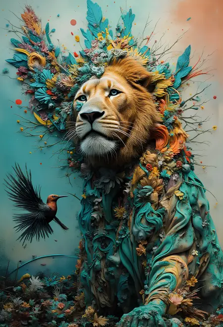 bo-abstract, In a surreal and captivating realm, an abstract lion emerges, its majestic form composed of shattered fragments that dance and glimmer in a harmonious chaos. The lion’s mane, exaggerated and wildly unruly, is a tumultuous blend of fluid metallic textures that shimmer as if kissed by starlight, giving it an otherworldly allure. Each shard refracts light in a dazzling spectrum of vibrant hues—fiery oranges, deep indigos, and electric blues—creating a visual symphony that enchants the observer. The background swirls with dreamlike abstractions, blending soft, ethereal clouds of color with intricate patterns that evoke a sense of fluid motion, like ripples on a calm sea. The atmosphere is infused with a feeling of ethereal grandeur, as if the lion is not merely an animal but a powerful guardian of a fantastical realm. As you gaze at its fractured geometry, you can almost hear a resonant echo, a blend of a distant roar and the soft whispers of wind that carry tales of ancient forests and hidden worlds.