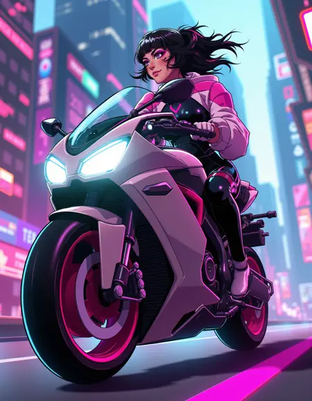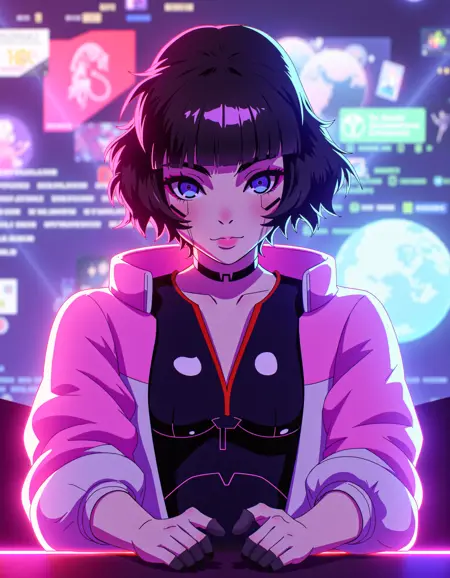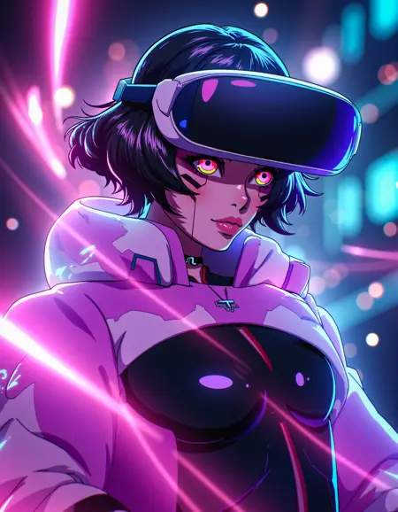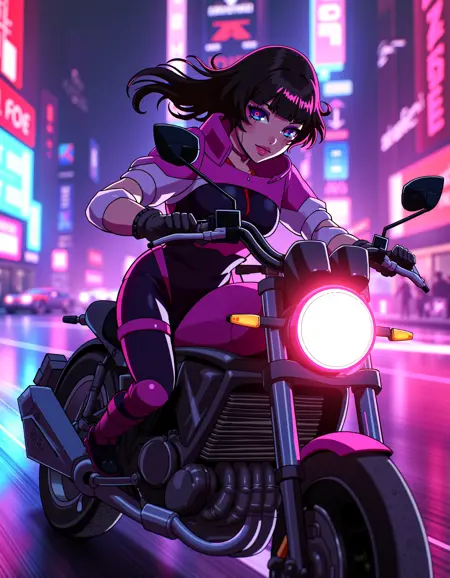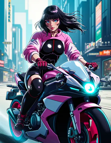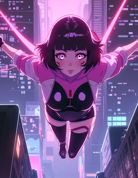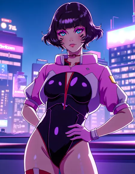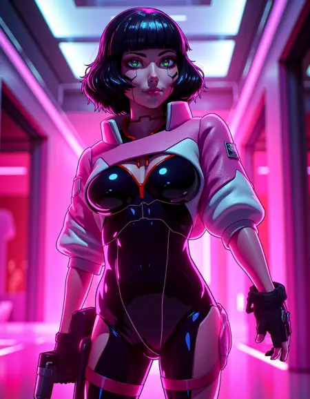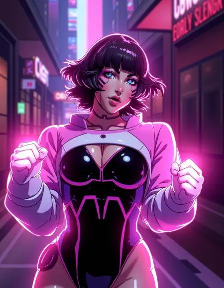 zavy-sasha, black bodysuit, pink with white shrugs, cyberpunk anime, neo-noir, neon light