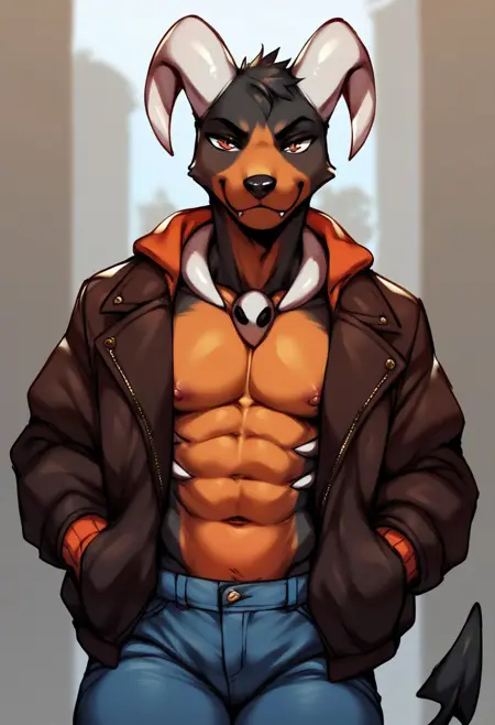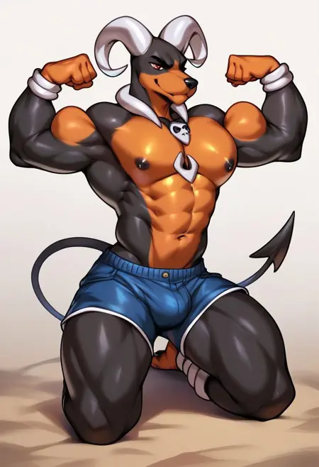 houndoom, curved horn, horns, black fur ,brown countershading, countershade fur, spade tail