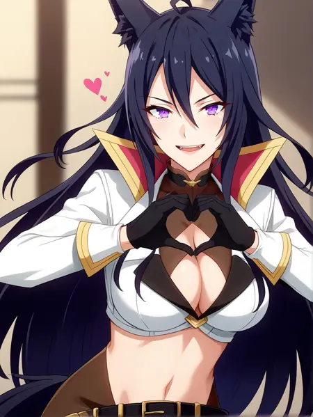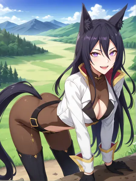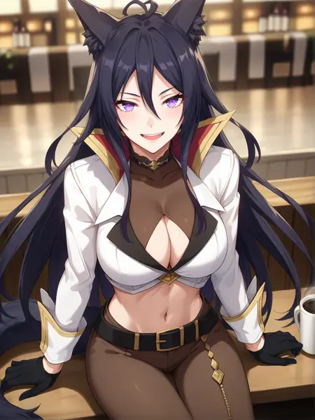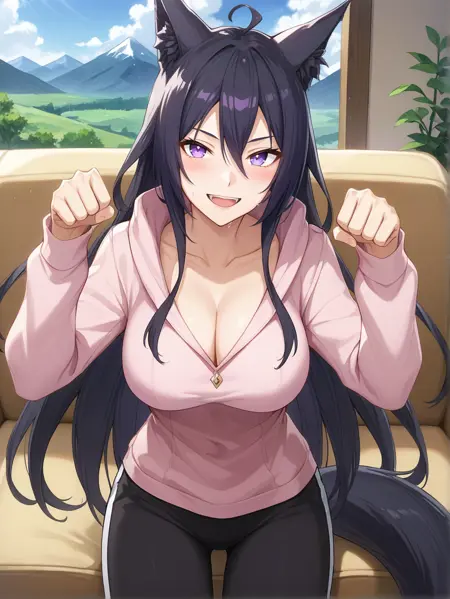 외모: 동물 귀, 동물 귀 털, 검은 머리, 긴 머리, 보라색 눈, 꼬리