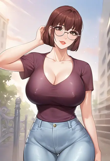 1. ((purple short-sleeves top, obscene cleavage, huge cleavage, blue denim trousers, glasses, ))