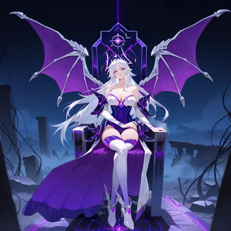 Form_3rd, 龙角, 龙翼, 暴露胸部, 紧身衣, 紫色紧身衣, 白色胸衣, 大腿靴, 白色鞋履, 水晶, 霓虹镶边, 无吊带, 肩部护甲, 护肩, 舞女裙, 紫色盔甲, 白色臂套, 饰品, 头冠, 长裙,