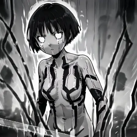 c0rtanah1, hologram, colored skin, short hair, 1girl, breasts, colored sclera