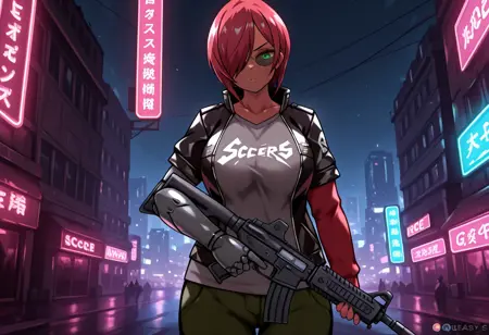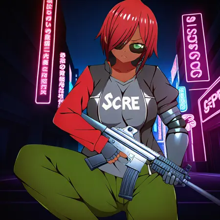 メインタグ: 1girl, 暗い肌, 緑の目, サイバネティックな目, 赤髪, 片目に髪をかけた, サイバネティックな腕, 機械の腕, 大きい胸