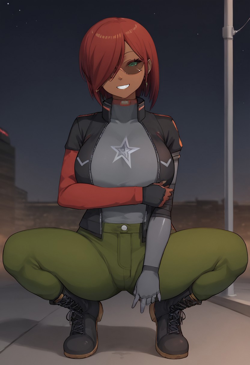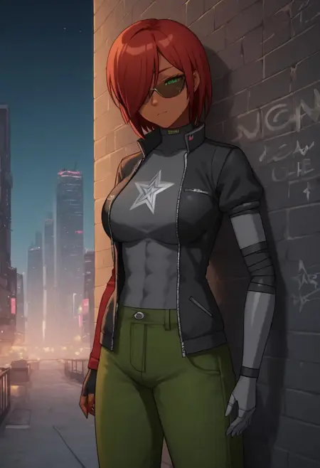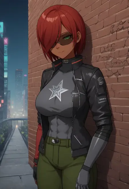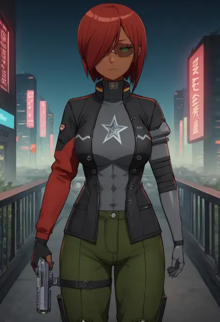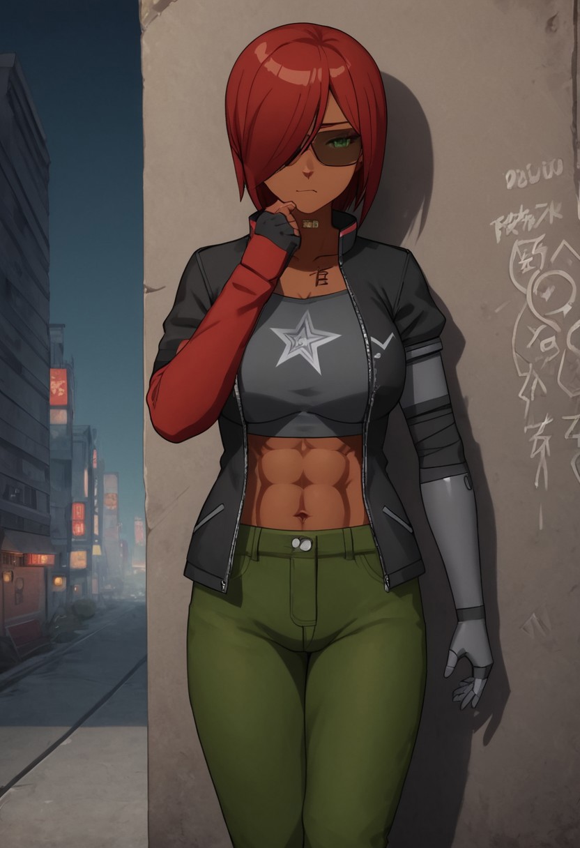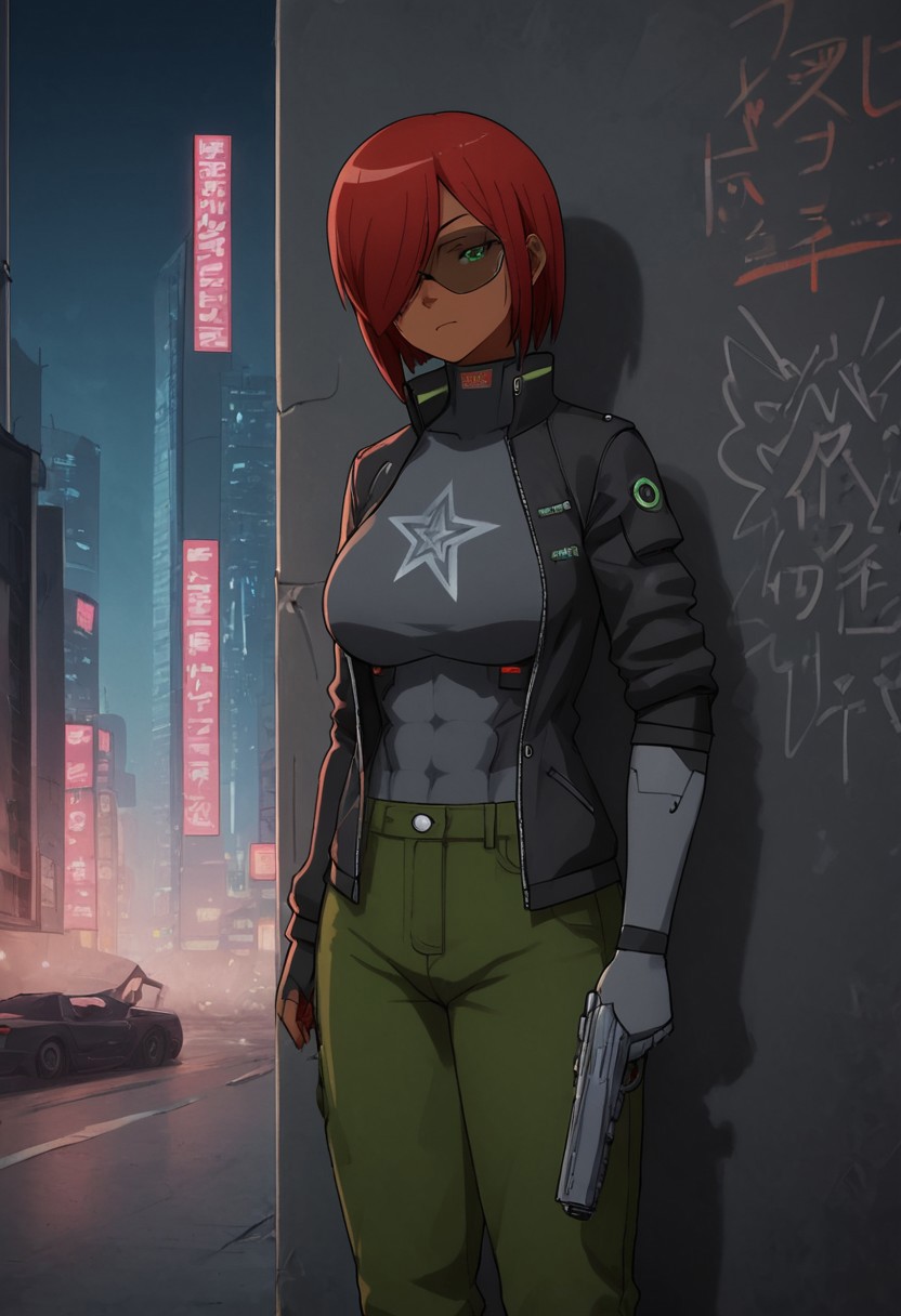 主要标签: 1girl, 深色皮肤, 绿色眼睛, 赛博格眼睛, 红发, 发丝遮住一只眼睛, 赛博格手臂, 机械臂, 大胸