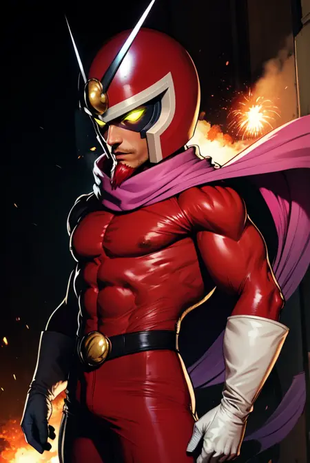 Viewtiful,红色紧身衣,(粉色围巾),戴着发光黄眼的头盔,白色手套和靴子,