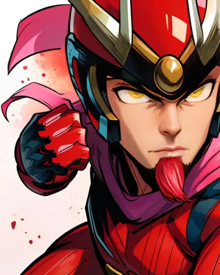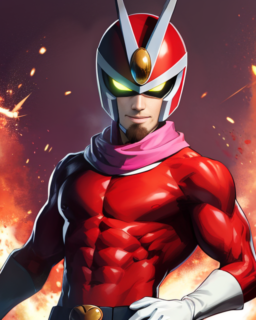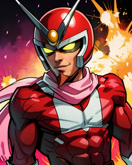 Viewtiful,红色紧身衣,(粉色围巾),戴着发光黄眼的头盔,白色手套和靴子,