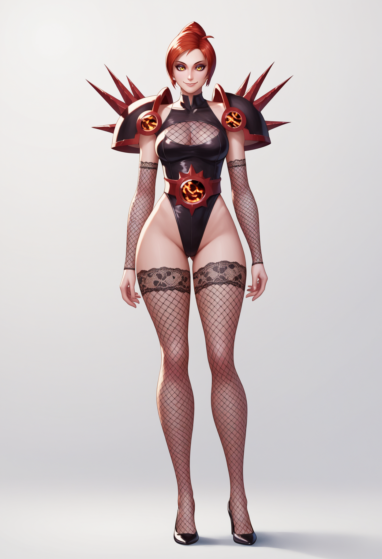 默认服装提示词:highleg leotard, spiked shoulder armor, magma belt, lace trim, fishnet thighhighs, detached fishnet sleeves, fishnet cutout, high heels
