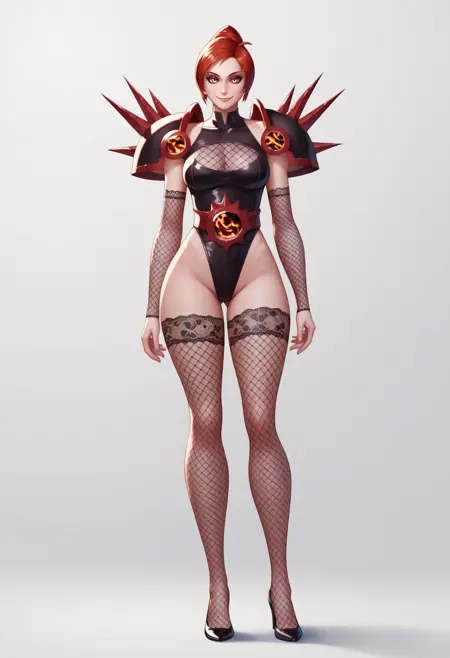 Default outfit prompts : highleg leotard, spiked shoulder armor, magma belt, lace trim, fishnet thighhighs, detached fishnet sleeves, fishnet cutout, high heels