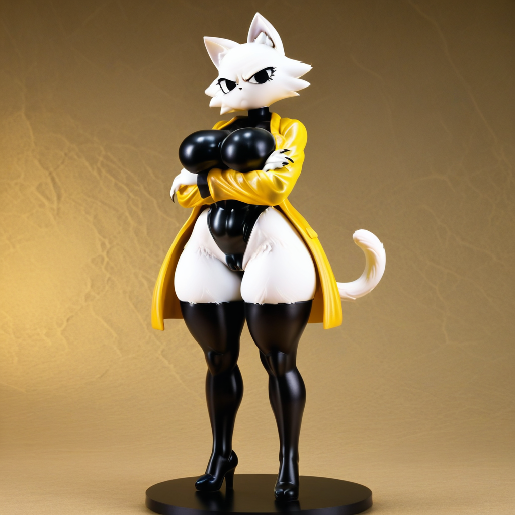 Base Body: Yi, score_9, colorful, 1catgirl, furry, female, anthro, huge breasts, cat ears, fluffy cat tail, white fur, very thick thighs, black eyes, black claws, big bubble butt, wide hips, mouthless, curvy body, chest accesory, dynamic light