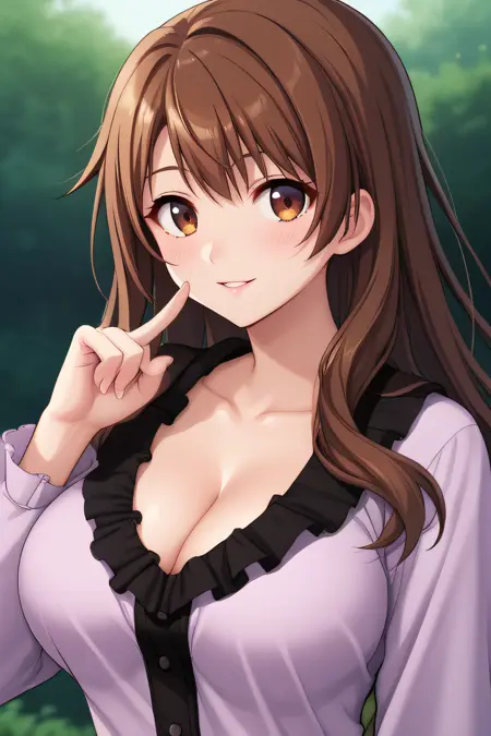 takasaki, long hair, brown hair, brown eyes, frilled shirt, black frills, large breasts, collarbone, light purple shirt, buttoned, cleavage, blue skirt