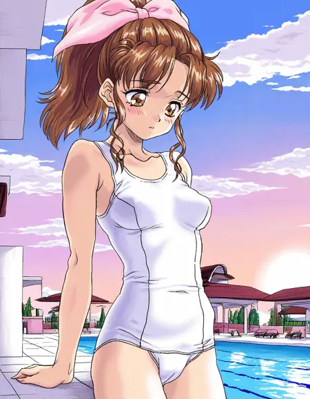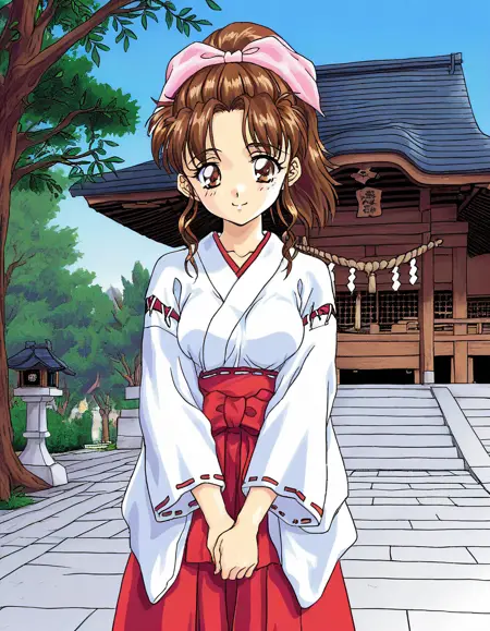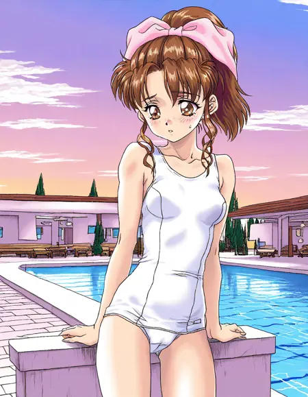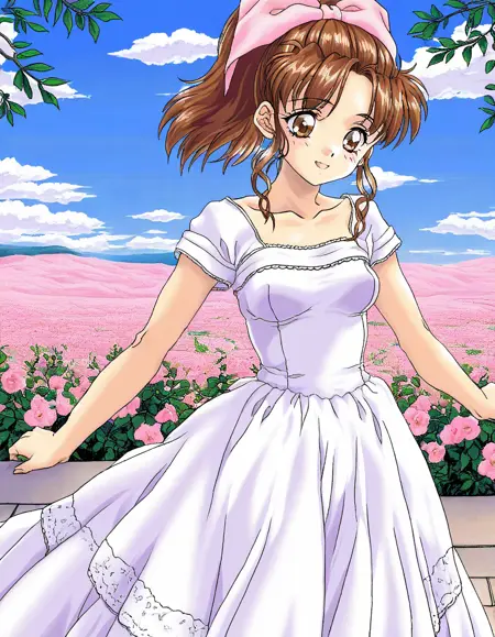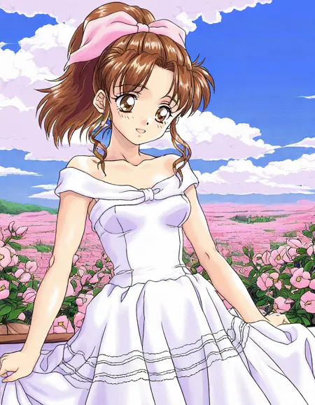 PC98のエロゲー「Nut Berry」よりポニーテールの女の子です。セリフもなければ名前もない。ポニテ 茶髪 ピンクのリボン以外すべてが不明です。唯一判明してることはこの子の原画が古美明(ラブエス、GREENのキャラデザの人)であるという事実のみ。素材が3枚しかないのですがloraが作れるかの実験作ですがテストした限り問題はなかったです。