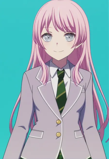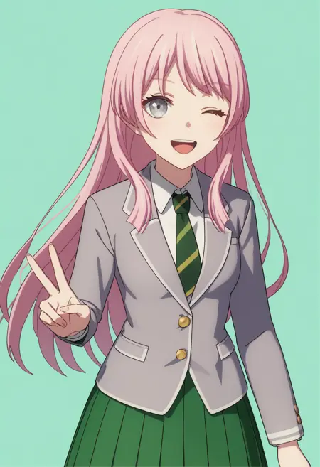冬服制服:chihaya anon, ピンクの髪, グレイの目, 冬季制服, 緑のネクタイ, 白いシャツ, グレイのジャケット, プラッドスカート, 緑のスカート, プリーツスカート