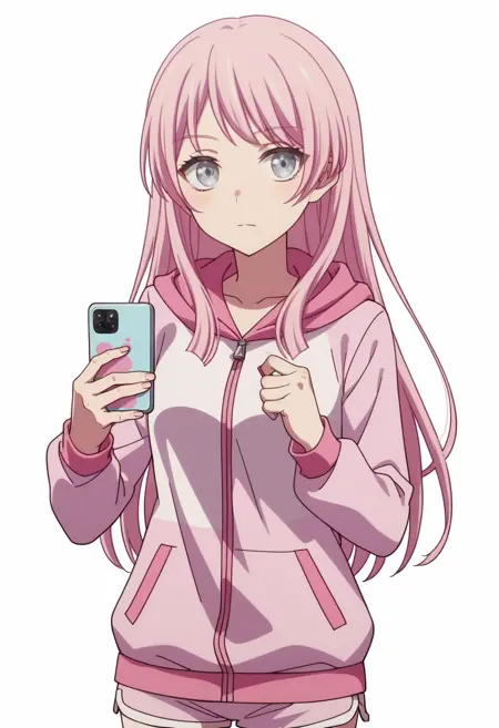 寝間着:chihaya anon, ピンクの髪, グレイの目, ホームクローズ, 短パン, フード付きジャケット, ピンクのフーディ