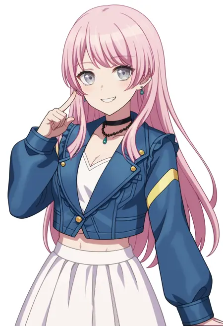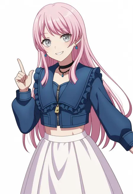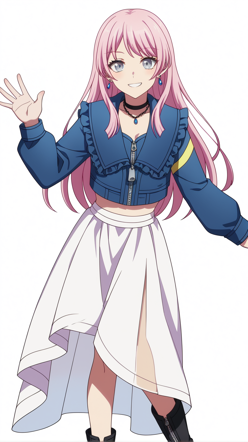 ライブ衣装:chihaya anon, ピンクの髪, グレイの目, 青いジャケット, 白いスカート, ロングスカート, 透け感のあるスカート, カロップジャケット, デニムジャケット, 黒いチョーカー, ネックレス, ピアス, ジッパー, フリル