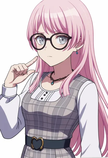 普段着:chihaya anon, ピンクの髪, グレイの目, ノースリーブドレス, ハートネックレス, チャンフー, プラッドドレス, 白いシャツ, グレイのドレス, グレイのベルト