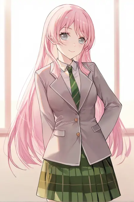 여름 학교 유니폼: chihaya anon, 분홍색 머리, 회색 눈, 여름 학교 유니폼, 녹색 넥타이, 갈색 스웨터 조끼, 흰색 셔츠, 반소매, 격무늬 치마, 녹색 치마, 주름 치마