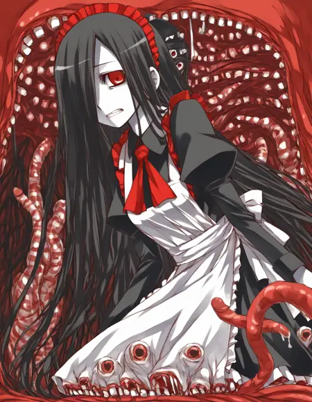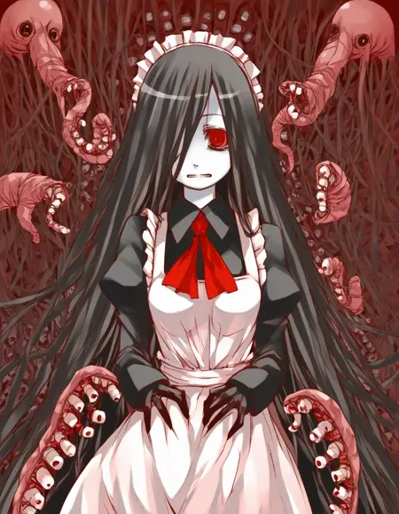 ozoimaid, black hair, long hair, hair over one eye, red eyes, maid headdress, maid