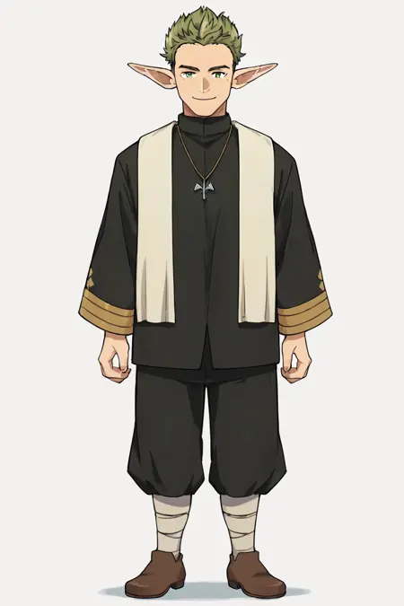 Black robe, priest, white drape, black pants, brown footwear, necklace