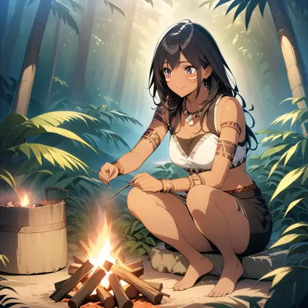 2ピースの効果を得るには、「Cropped top」と「toned midriff」のタグを使用してください。1ピースのドレスを描きたい場合は、「dress」タグを使用できます。「Fur Trim」を追加すると、服がより原始的な外観になります。