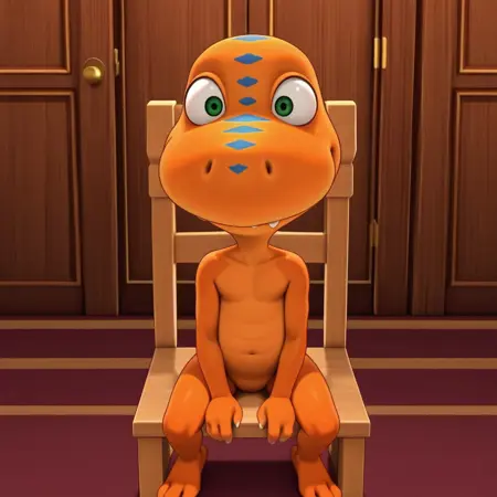 dtbuddyil, semi-anthro, male, Tyrannosaurus, orange skin, blue stripes, green eyes,