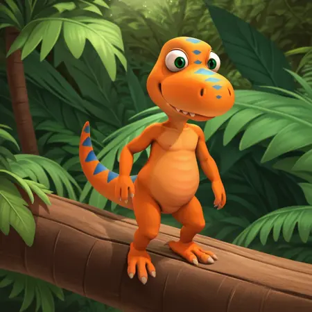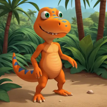 dtbuddyv2, semi-anthro, male, Tyrannosaurus, orange skin, green eyes,
