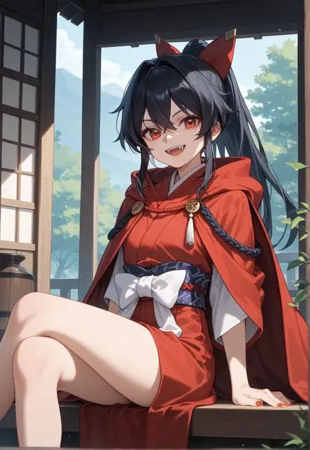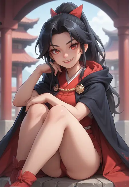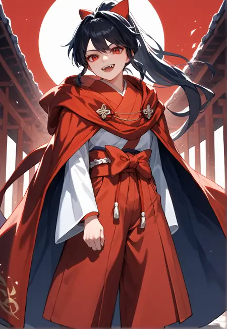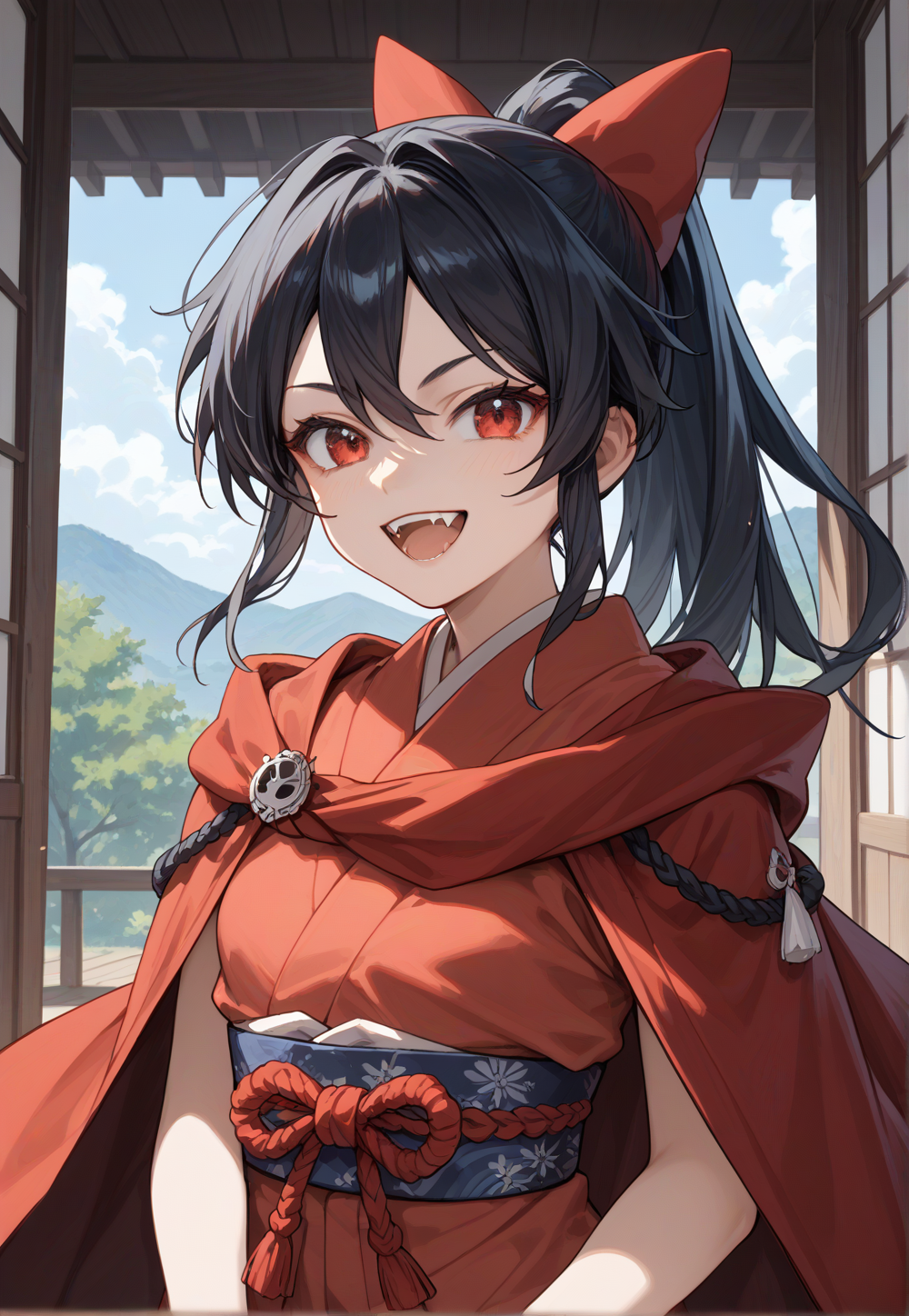 - 1girl, solo, long hair, fangs, bangs, black hair, brown eyes, fangs, long hair, ponytail, bow, hair red bow, japanese clothes, barefoot, fingerless gloves, gloves, cape, cloak, barefoot, fingerless gloves, red kimono, kimono, weapon, bow (weapon)
