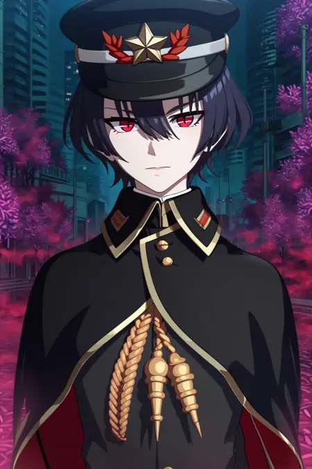 Clothes: military uniform,black cape,white gloves,