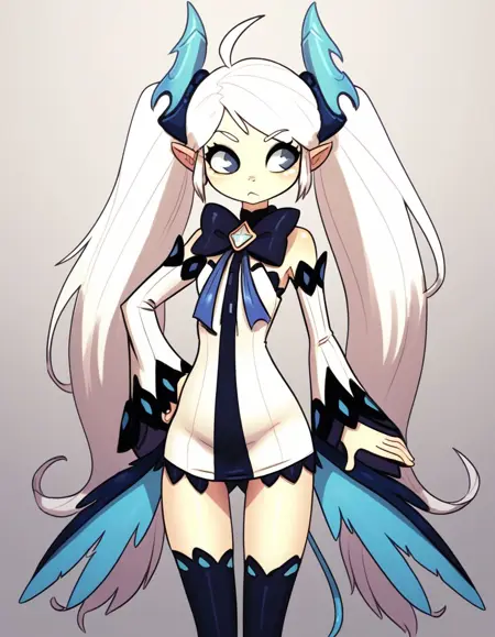 luciela r. sourcream , diabla , gradient skin, petite, flat chest, symbol-shaped pupils, navel, single pantsleg,