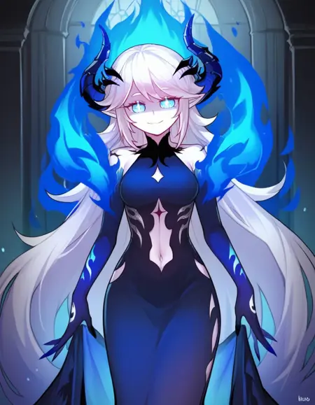 luciela r. sourcream, iblis, petite, flat chest, short hair with long locks , white hair , symbol-shaped pupils, gradient skin, navel_cutout , flame trim, tattoo, black fire ,