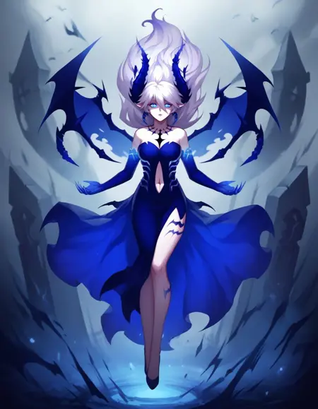 luciela r. sourcream , diabla , alternate form, mature female, symbol-shaped pupils, hair between eyes, navel cutout, gradient skin , strapless dress , elbow gloves,