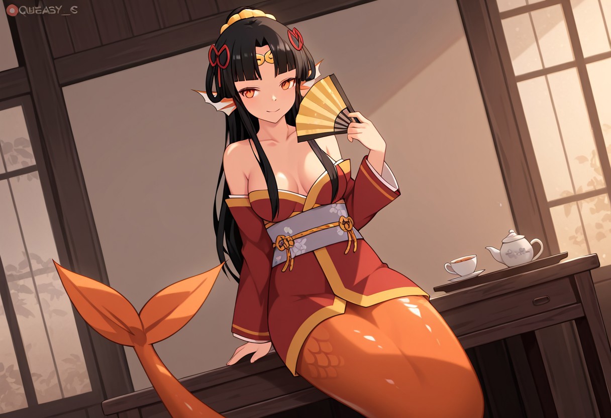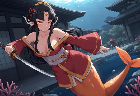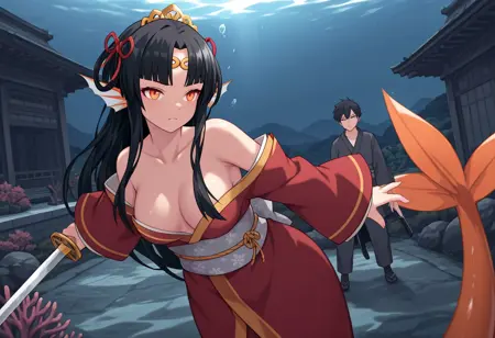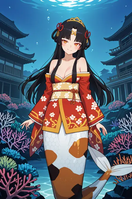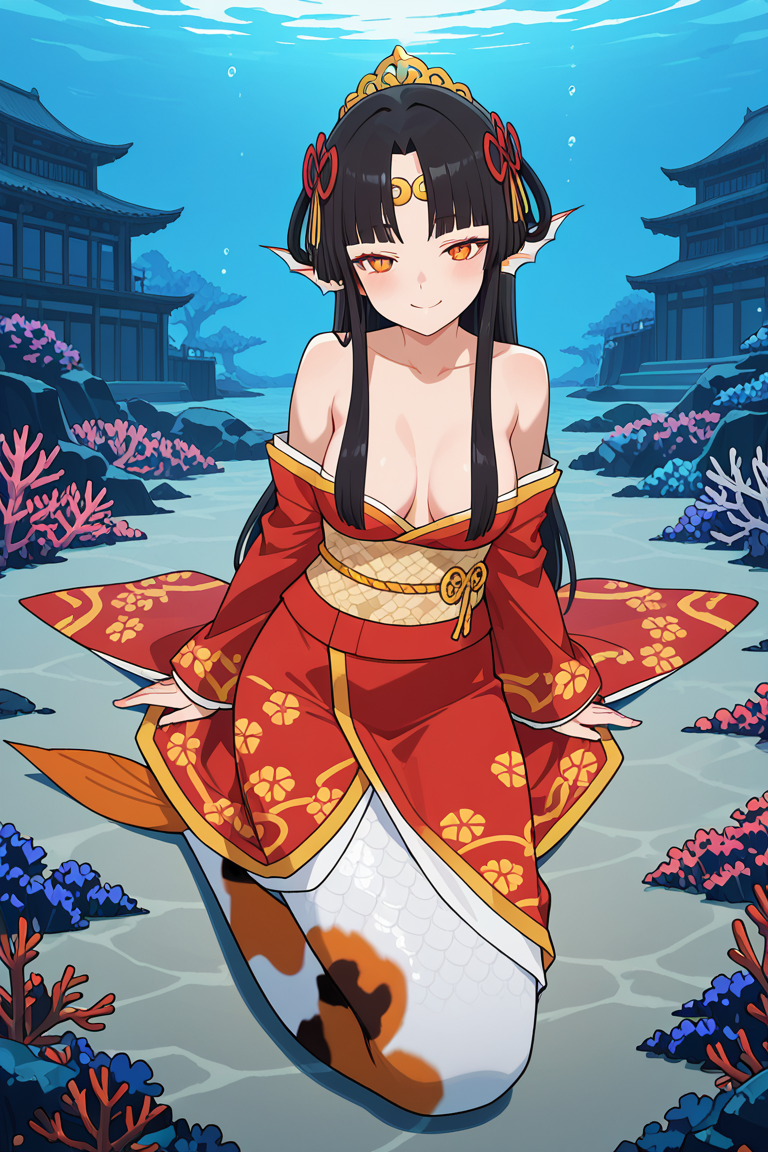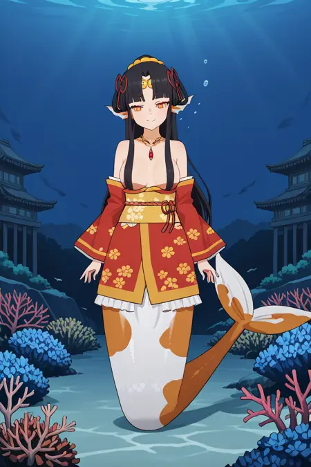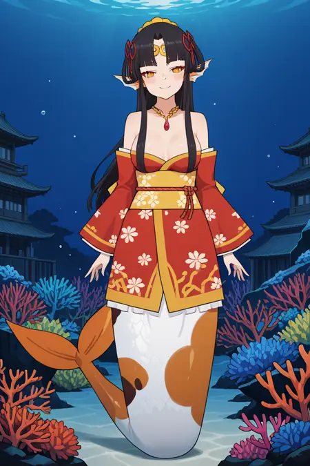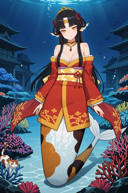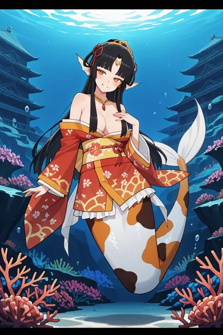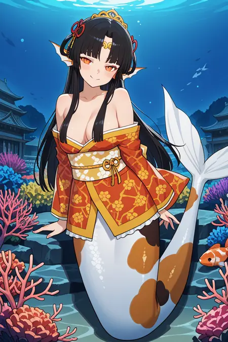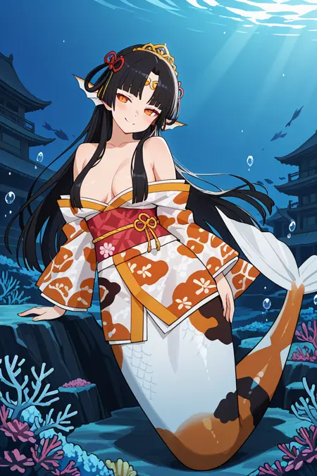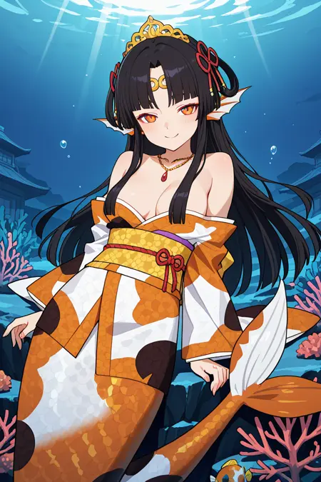 主要タグ:1girl、モンスターガール、人魚、人魚の尾、頭部のヒレ、黒髪、ロングヘア、姫カット、髪のカール、胸元の髪、ゴールドのティアラ、中程度の胸、アイシャドウ、オレンジ色の目、垂直の瞳孔、コイの尾