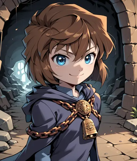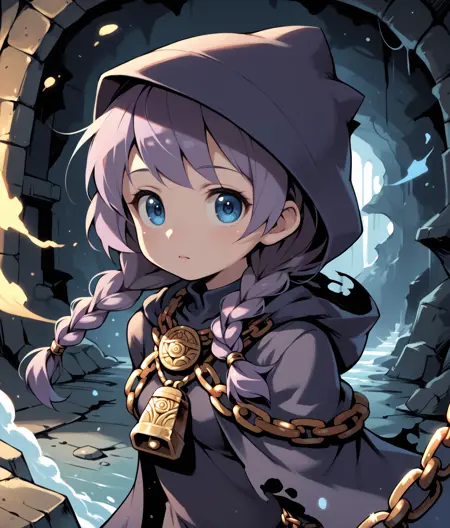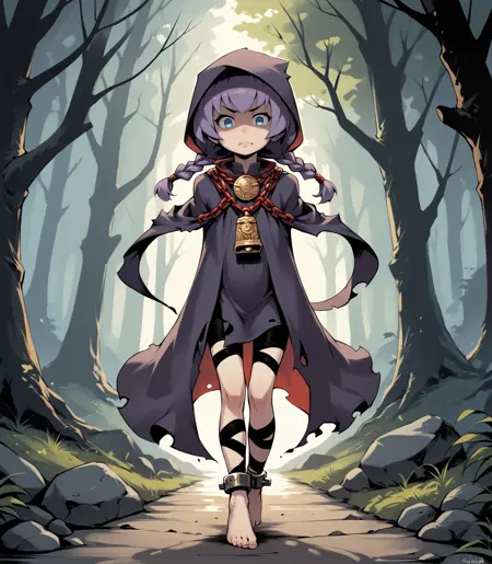 薄い肌、短い髪、マント、破れた服、フード、フードをかぶる、メダリオン、鎖、鈴、鎖镣、包帯、黒い包帯