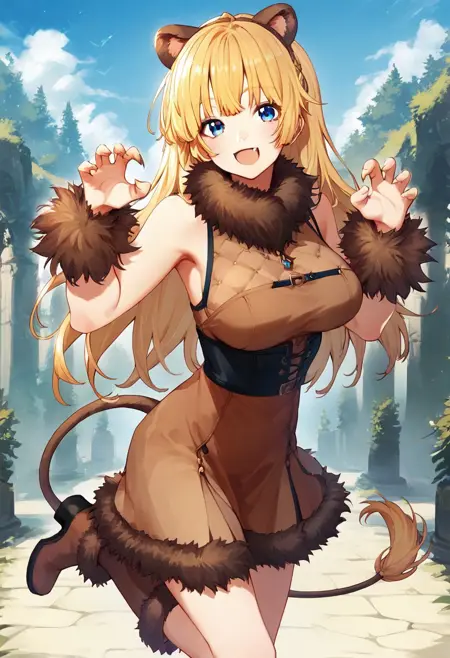 angelica_animal, bangs, long hair, animal ears, dress, tail, fur trim, fake animal ears, sleeveless, boots, sleeveless dress, brown dress, fur collar,