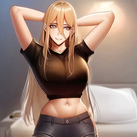 1. ((sexy short-sleeves black top, midriff, denim shorts, ))