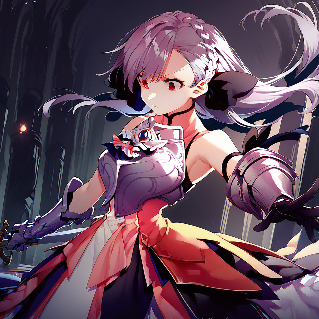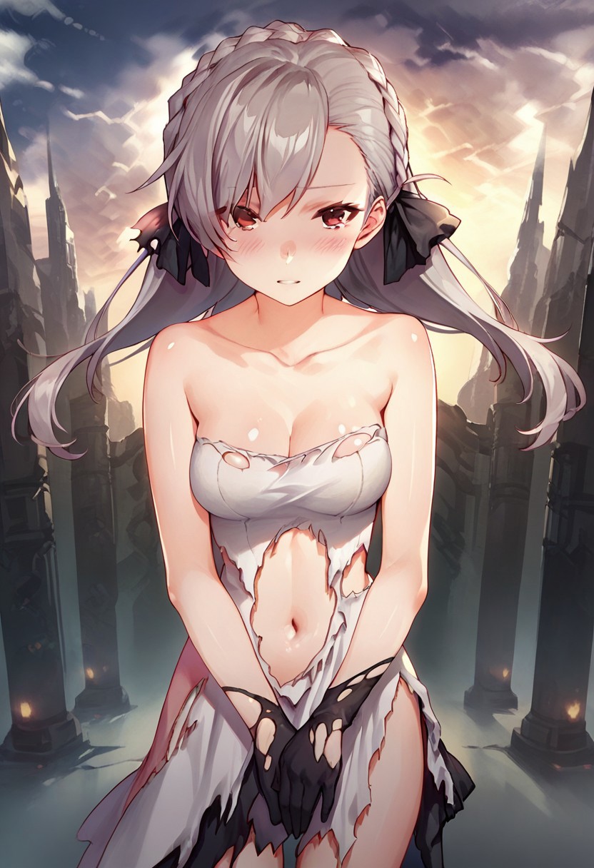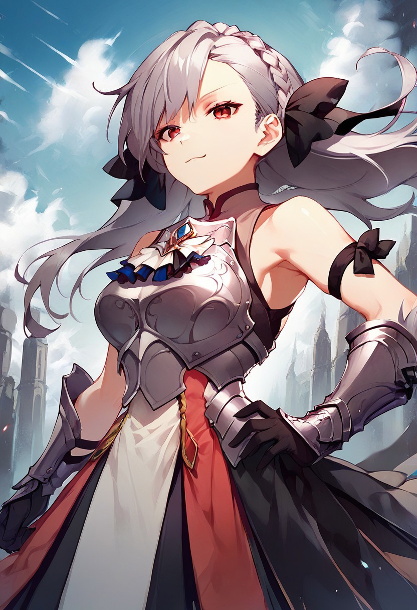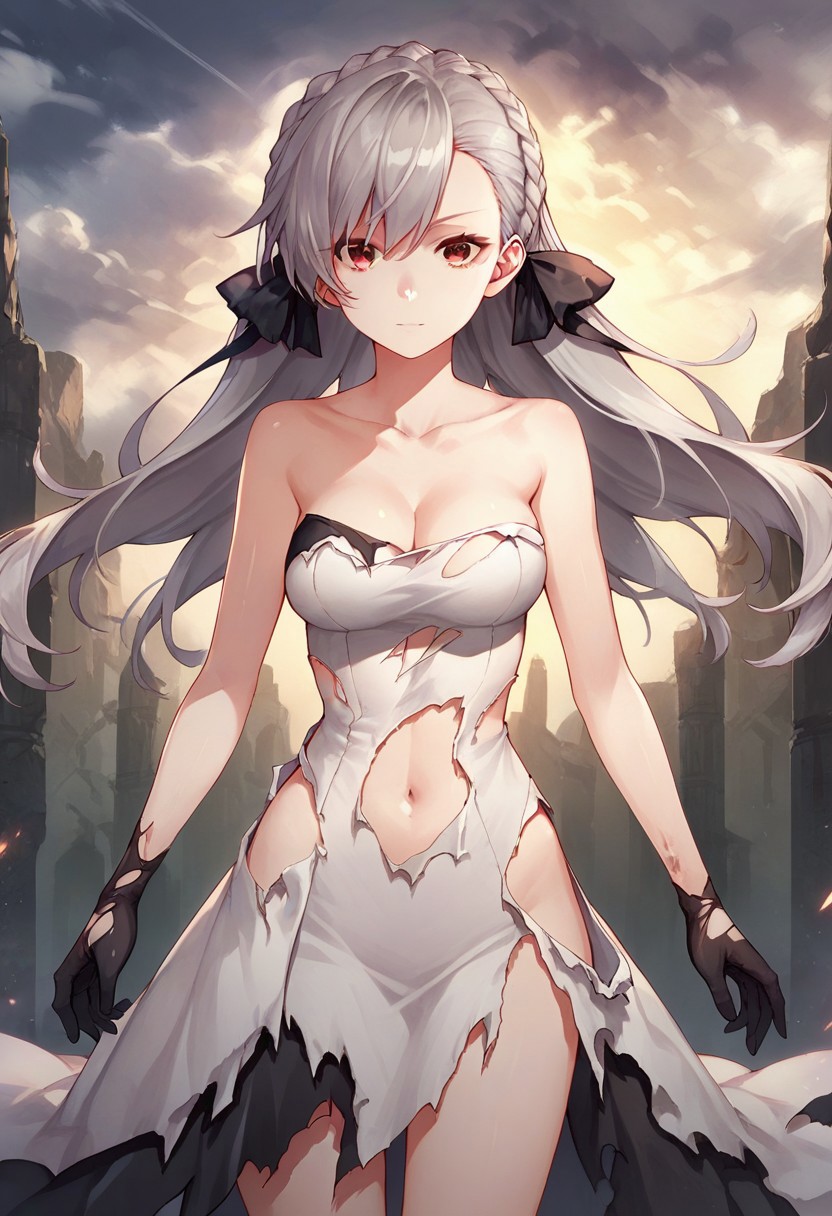 Shalliceres, braid, grey hair, 1girl, solo, long hair, floating hair, crown braid, red eyes, black ribbon, bangs, hair bow, hair ribbon, breasts,