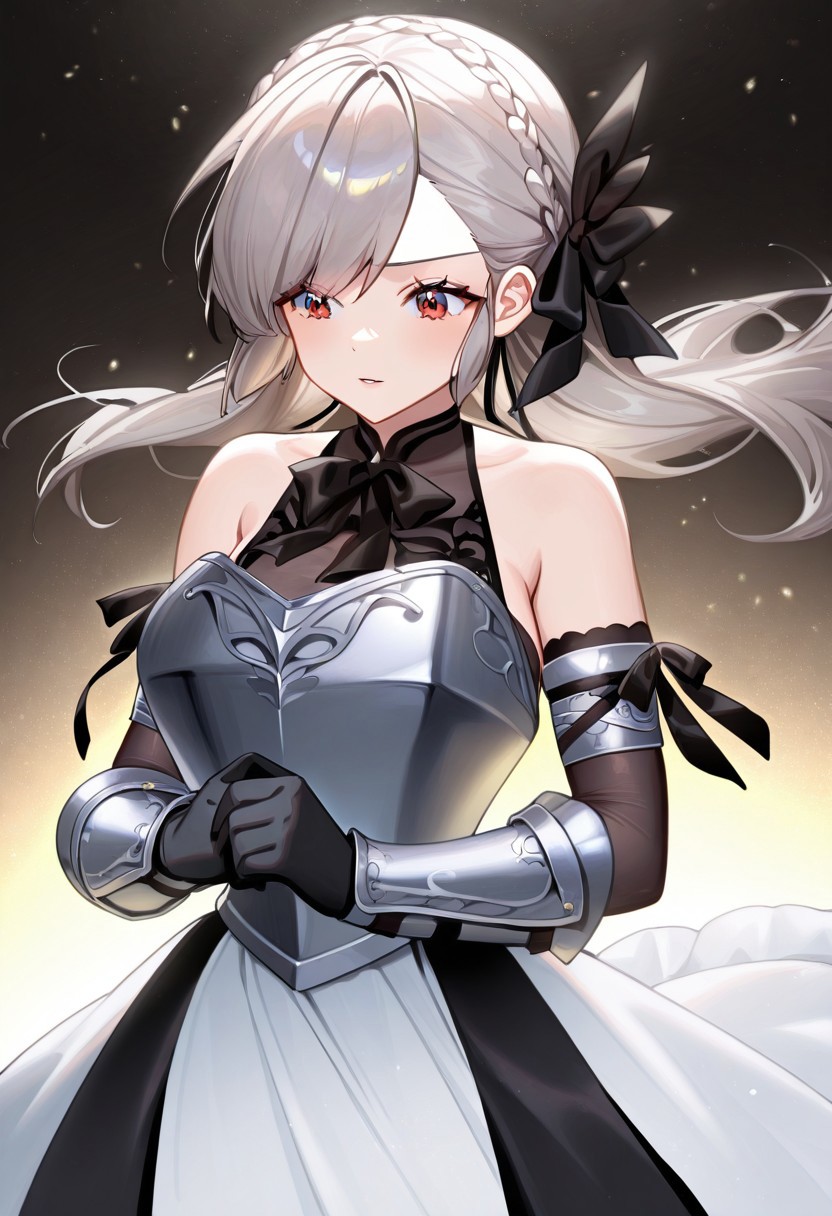 Shalliceres_armor, dress, gloves, black gloves, armor dress, armor, breastplate, sleeveless, bare shoulders,
