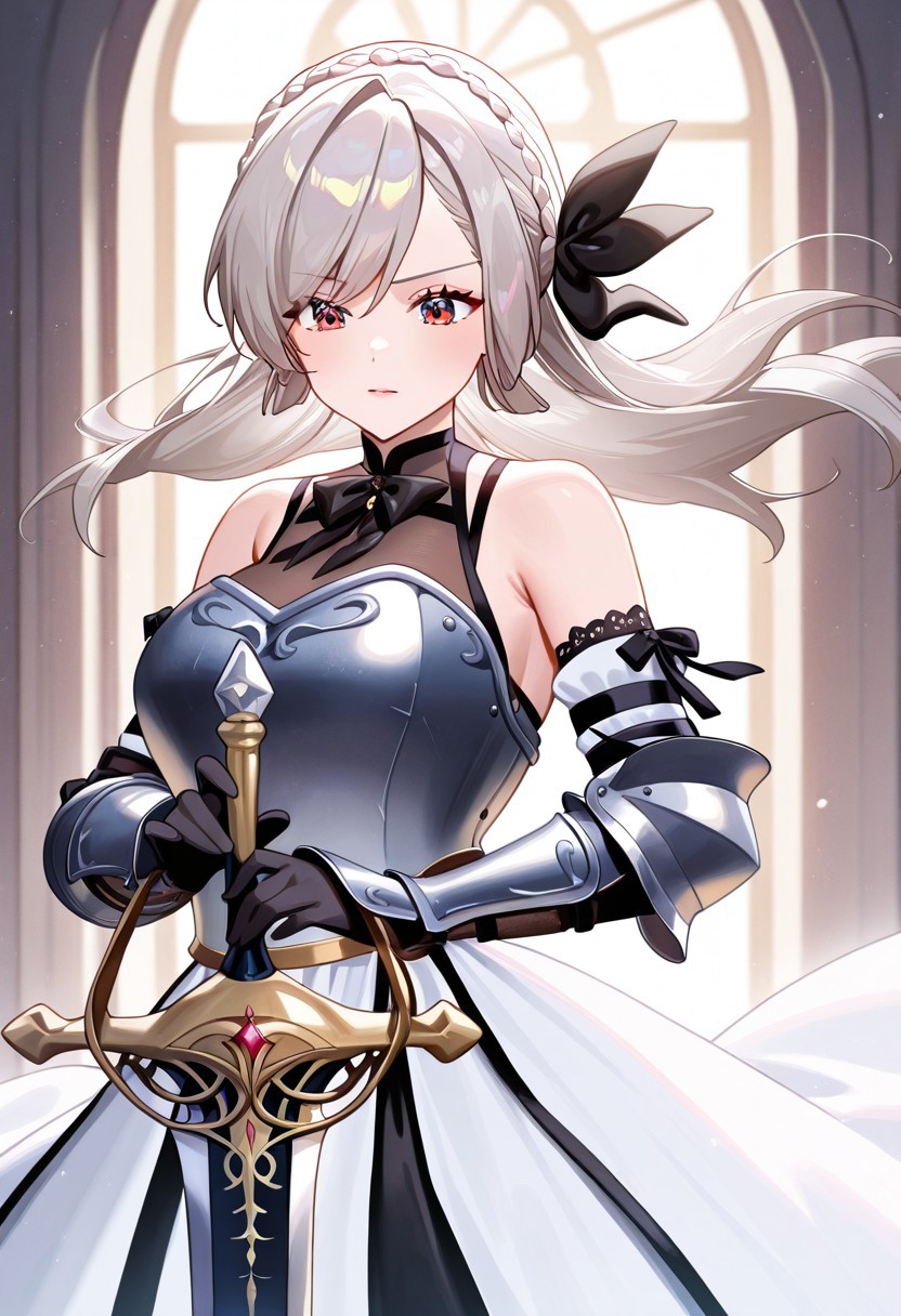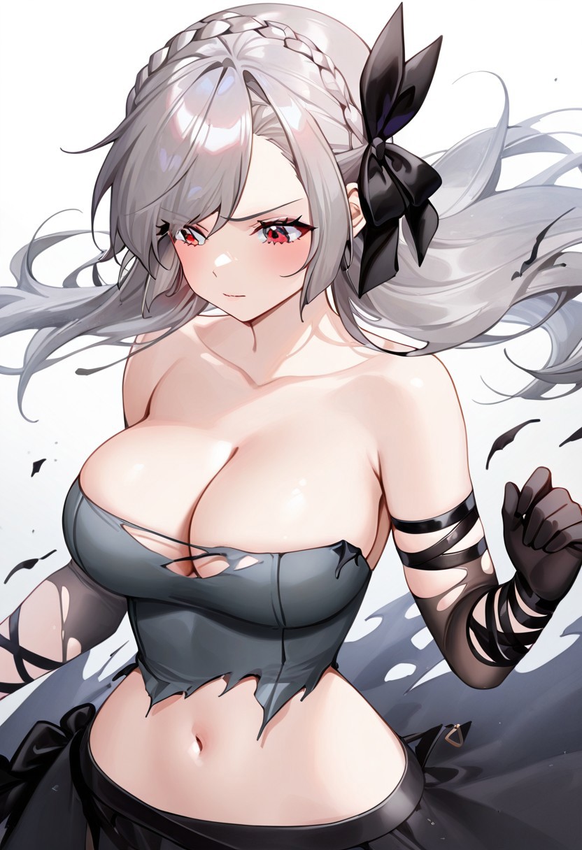 Shalliceres, braid, grey hair, 1girl, solo, long hair, floating hair, crown braid, red eyes, black ribbon, bangs, hair bow, hair ribbon, breasts,