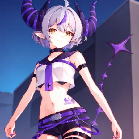 la+ darknesss \(第四套服装\),白衬衫,肚脐,尾巴,灰发,白色夹克,呆毛,辫子,紫发,多色发,角,领带,断袖,短裤,无袖,黑色项圈,尖耳,腰带,露出腹部,水手领,指甲油,挑染发,大腿绑带,黑短裤,恶魔女孩,恶魔角,紫色指甲,手臂绑带,紫色领带,条纹角,条形码纹身