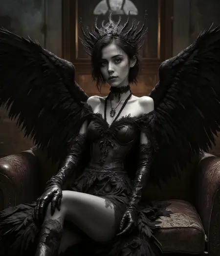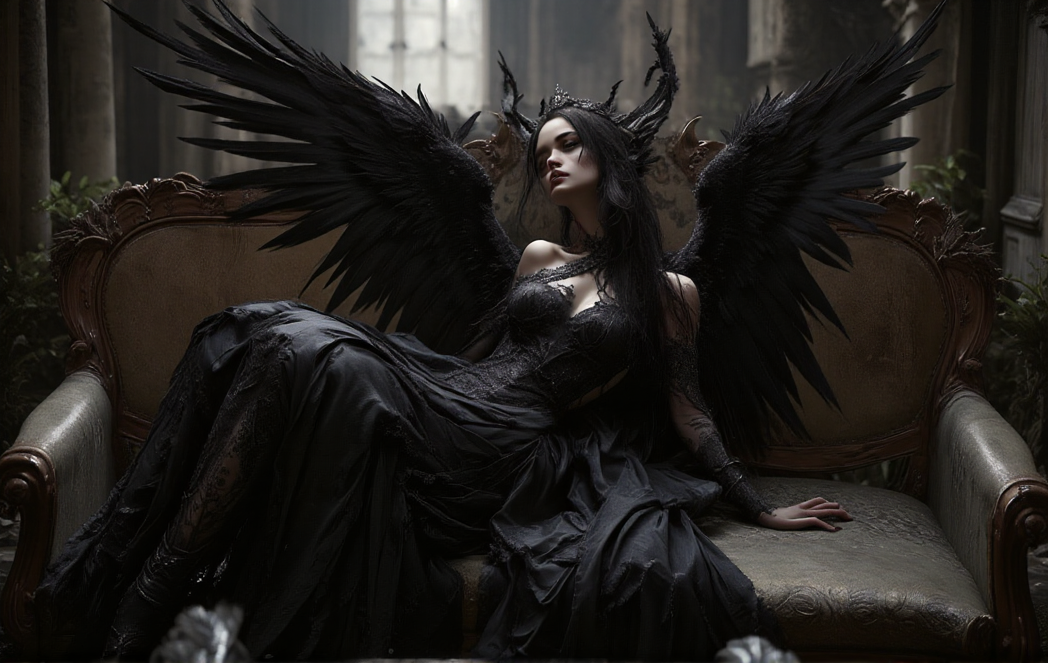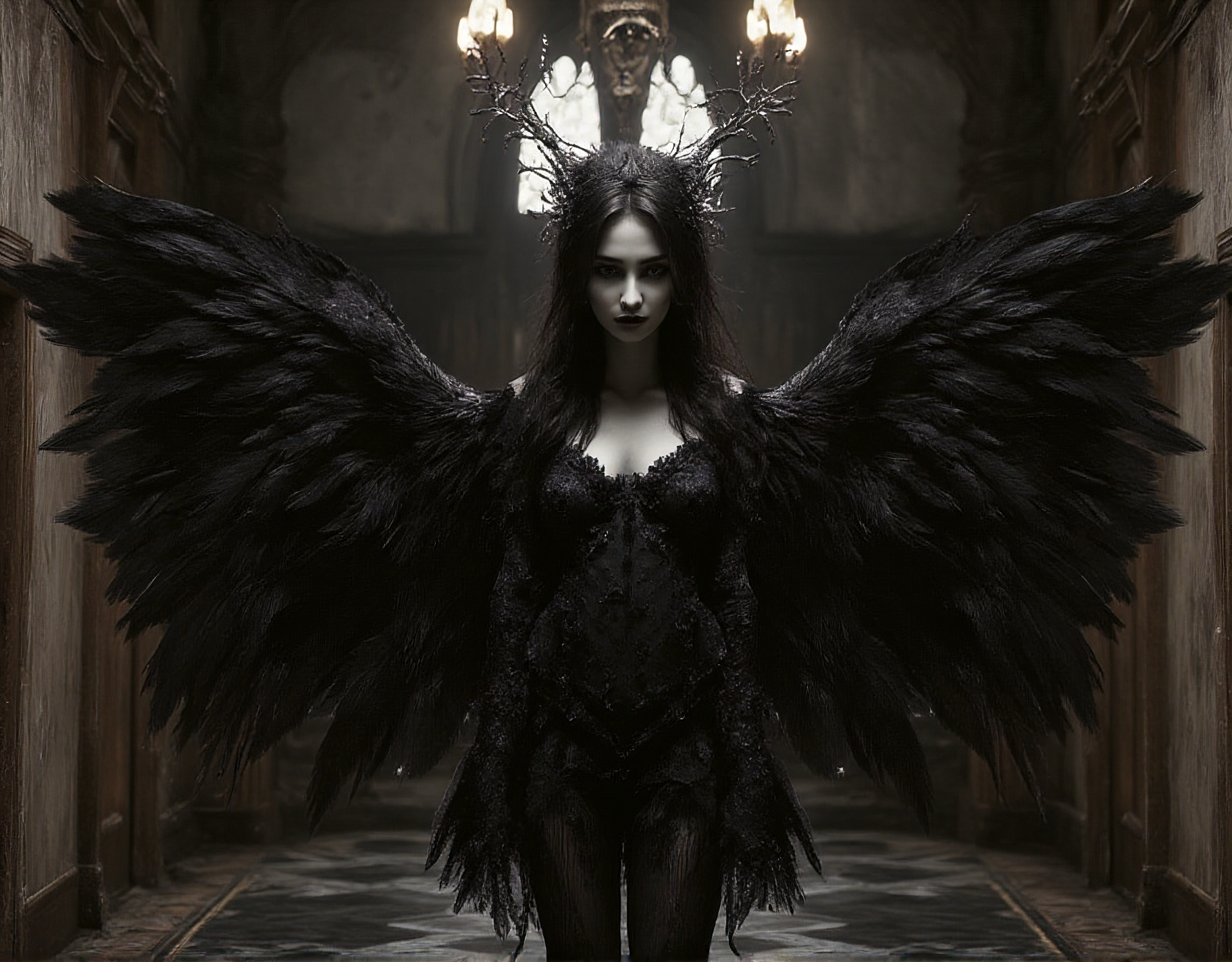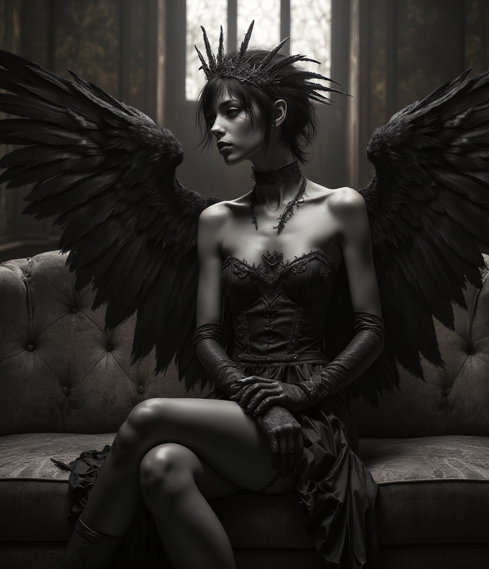 1girl, absurdly long hair, akthahtka, angel wings, antlers, arm support, arm tattoo, armor, arms at sides, backlighting, bare shoulders, belt, black bra, black choker, black dress, black eyes, black feathers, black gloves, black hair, black leotard, black lips, black nails, black panties, black skirt, black thighhighs, black wings, blonde hair, blood, blue eyes, blurry, blurry background, boots, bottomless, bra, braid, breasts, brown eyes, brown hair, bustier, cape, choker, church, cleavage, closed eyes, closed mouth, collarbone, colored skin, corset, covering, covering breasts, crop top, cross, crossed legs, crown, dark, day, dress, earrings, elbow gloves, facial mark, facing viewer, feather trim, feathered wings, feathers, fingerless gloves, fishnets, flame, from side, full body, garter belt, garter straps, gloves, gothic, grey eyes, grey skin, hair between eyes, hair bun, hair ornament, hair over one eye, halo, hand on own chest, hand on own knee, high heels, horns, indoors, jewelry, knee up, lace, lace trim, lace-trimmed legwear, latex, leather, leotard, lingerie, lips, lipstick, long hair, looking at viewer, lying, makeup, mask, medium breasts, midriff, miniskirt, mole, navel, necklace, nipples, no panties, nose, on back, on floor, one eye closed, own hands together, pale skin, panties, pantyhose, parted lips, piercing, pillar, pillow, pleated skirt, pointy ears, realistic, red lips, short hair, short shorts, shorts, sitting, skirt, sleeveless, small breasts, smile, socks, solo, spread legs, stairs, standing, strapless, strapless dress, sword, tank top, tattoo, thigh boots, thighhighs, tiara, torn clothes, tube top, underwear, very long hair, weapon, white eyes, white hair, window, wings,