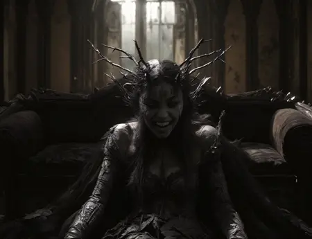 また、キーワード(この場合akthahtka)を最小限に使った記述でもLoRAが動作することを確認しています。例:highly detailed photo of akthahtka, she has (black wings) and a (black tiara), grinning pointing and looking about, bleak outdoor battlefield, medieval death and gloom. (((outdoors))), (((dusk))),(depth of field), blurry, blurry background, raw photo, analog photo, film grain