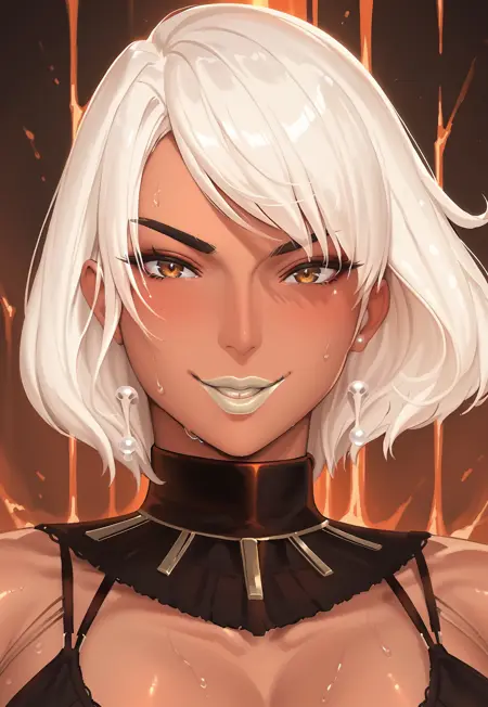 KhulanTower, 1girl, muscular, short hair, white hair, asymmetrical bangs, brown eyes, white lipstick,