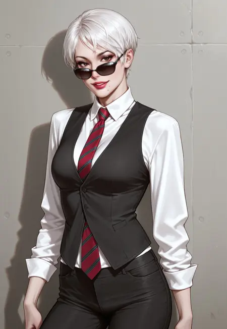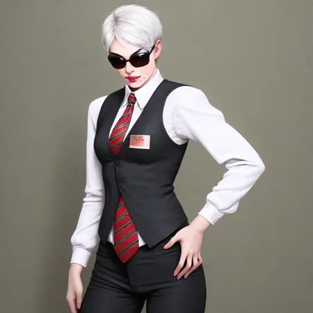 칼라 셔츠, 조끼, 바지, 빨강 줄무늬 넥타이