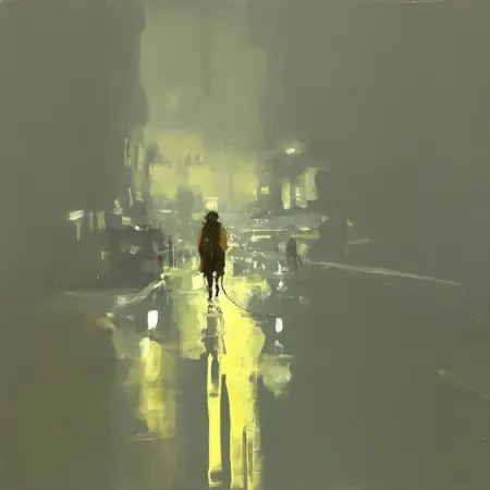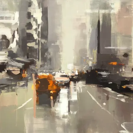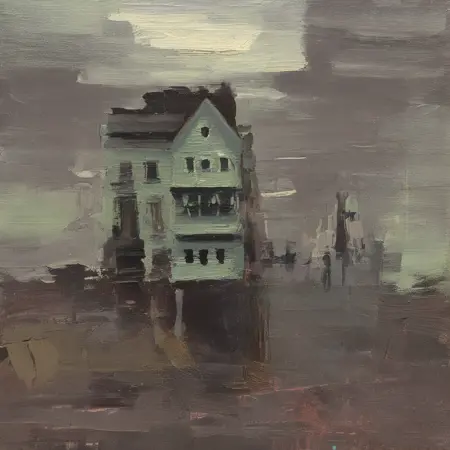 城市景观:曼最著名的作品描绘了阴暗、忧郁的城市景象,常以旧金山夜晚的街道为灵感。他运用动态的笔触和模糊的形态,营造出雨水、倒影和雾气的效果。