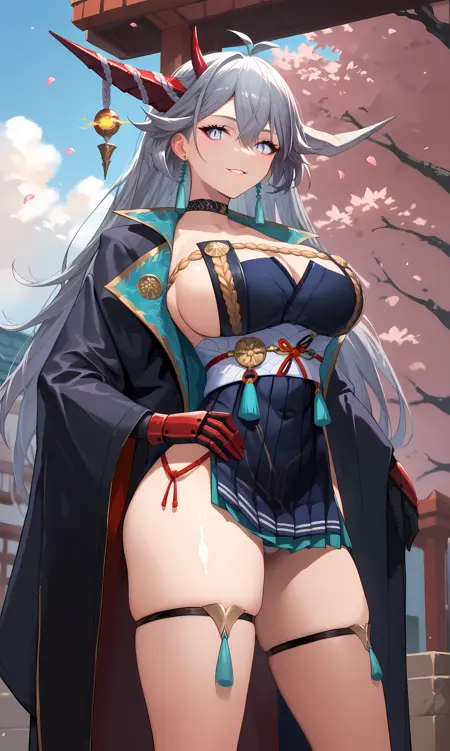 팔 보호대, 허리띠, 허벅지 스트랩, 주름 치마, 검은 코트, 벌어진 옷, 넓은 소매, 검은 드레스, 일본식 복장, 팔 없음, 검은 팔꿈치 장갑, 목걸이, 측면 슬릿