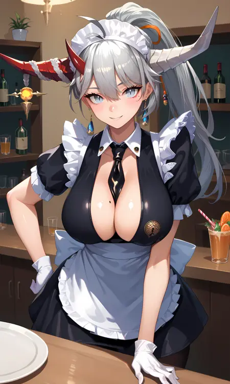 hakuryuu, 회색 눈, 늘어진 동공, 뿔, 이색 뿔, 어긋난 뿔, 회색 머리, 긴 머리, 땋은 머리, ahoge, 귀걸이