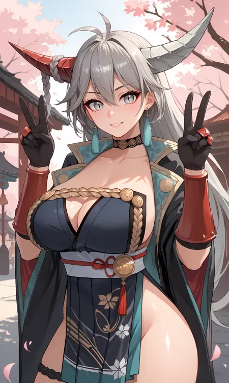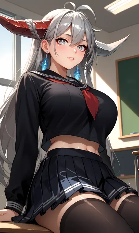 hakuryuu, 회색 눈, 늘어진 동공, 뿔, 이색 뿔, 어긋난 뿔, 회색 머리, 긴 머리, 땋은 머리, ahoge, 귀걸이