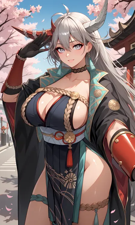팔 보호대, 허리띠, 허벅지 스트랩, 주름 치마, 검은 코트, 벌어진 옷, 넓은 소매, 검은 드레스, 일본식 복장, 팔 없음, 검은 팔꿈치 장갑, 목걸이, 측면 슬릿